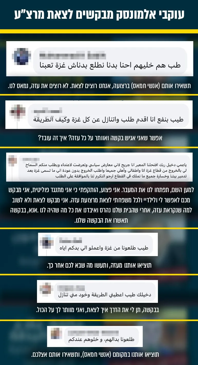 "אנחנו שומעים אתכם ויודעים שיש מי מכם שרוצים לעזוב את רצועת עזה. אתם כותבים לנו על כך בתגובות ובהודעות פרטיות בדף אלמונסק. כך למשל, בעקבות הפרסום שלנו מתחילת השבוע על בכירי חמאס שבורחים מהרצועה ומשתמשים בכם שוב כמגן אנושי, רבים מכם כתבתם בתגובה על רצונכם לעזוב את הרצועה. ברצוננו להבהיר: שגרירויות רבות בעולם פונות בשמכם ומבקשות לקלוט אתכם במדינתן. אנחנו נמשיך לתאם פינויים נוספים לבקשת השגרירויות. הפינוי יתבצע בכפוף לקבלת בקשה משגרירות של המדינה הקולטת".