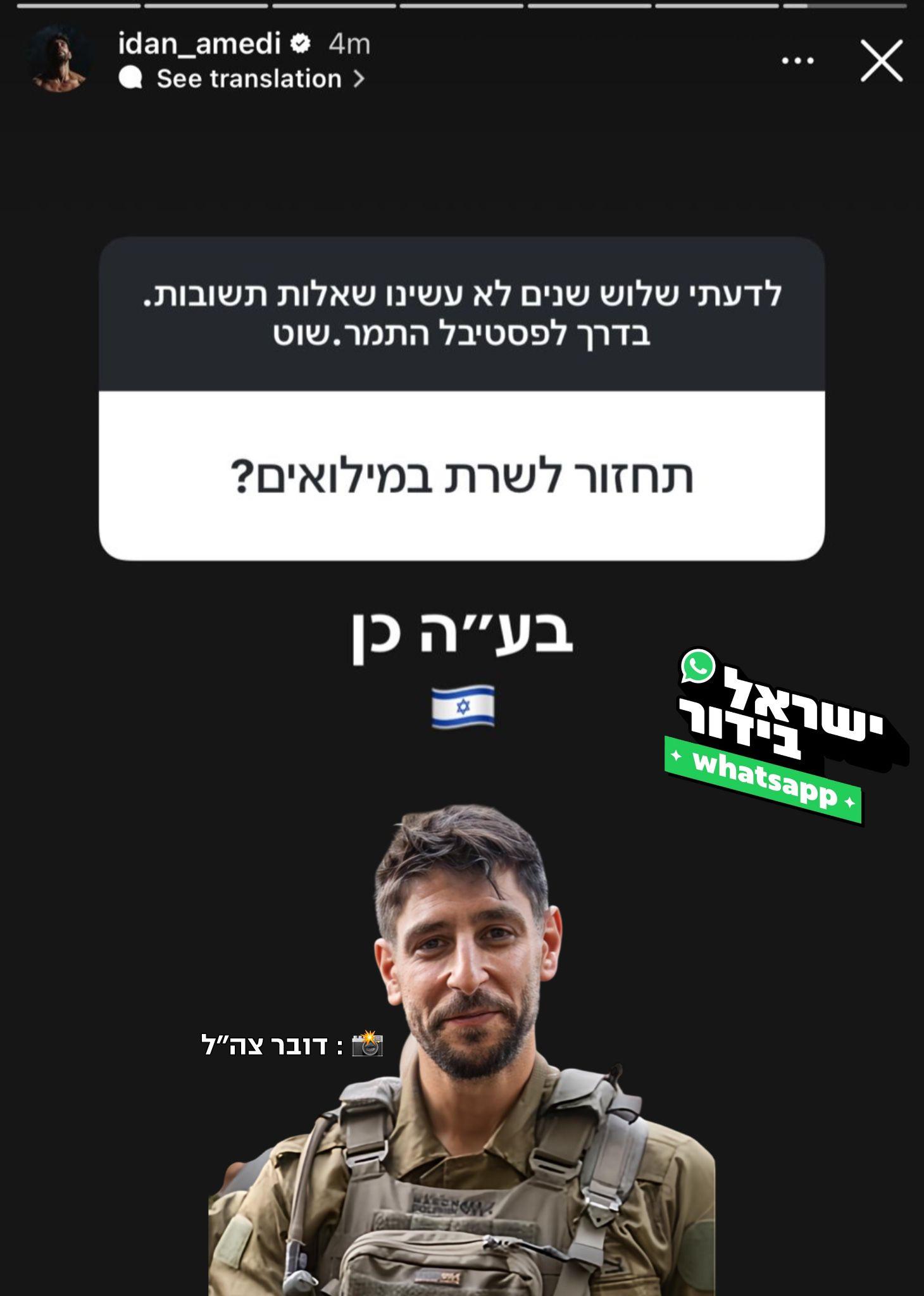 מלך: *עידן עמדי* הגיבור ששירת במילואים מה-7/10/23 עד שנפצע בחודש ינואר בשנה שעברה באורח קשה, משתף שהוא מתכוון לחזור לשרת את המדינהמלך: *עידן עמדי* הגיבור ששירת במילואים מה-7/10/23 עד שנפצע בחודש ינואר בשנה שעברה באורח קשה, משתף שהוא מתכוון לחזור לשרת את המדינה 🇮🇱👑0 תגובות 0 שיתופים 144 צפיות 0 ביקורות